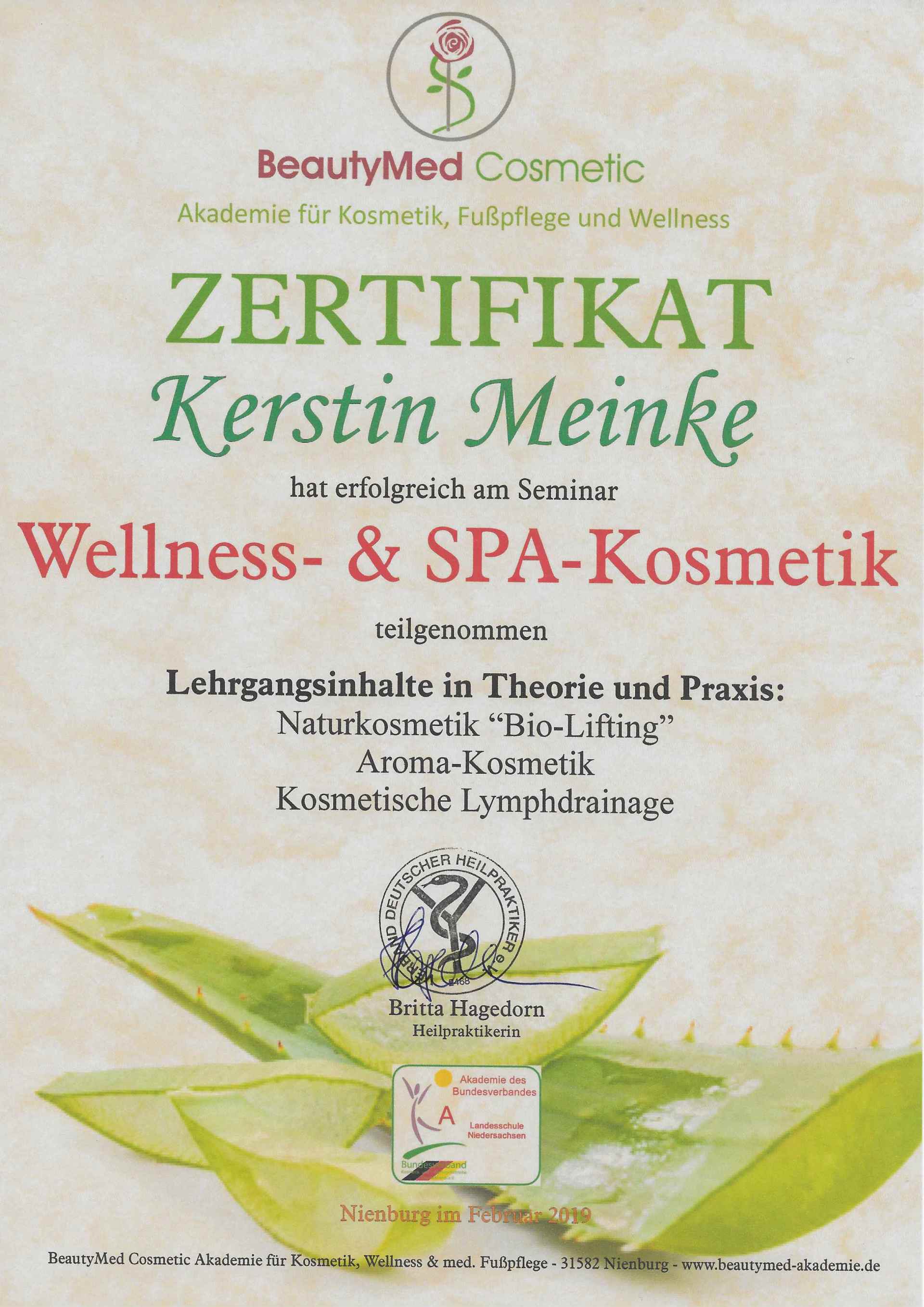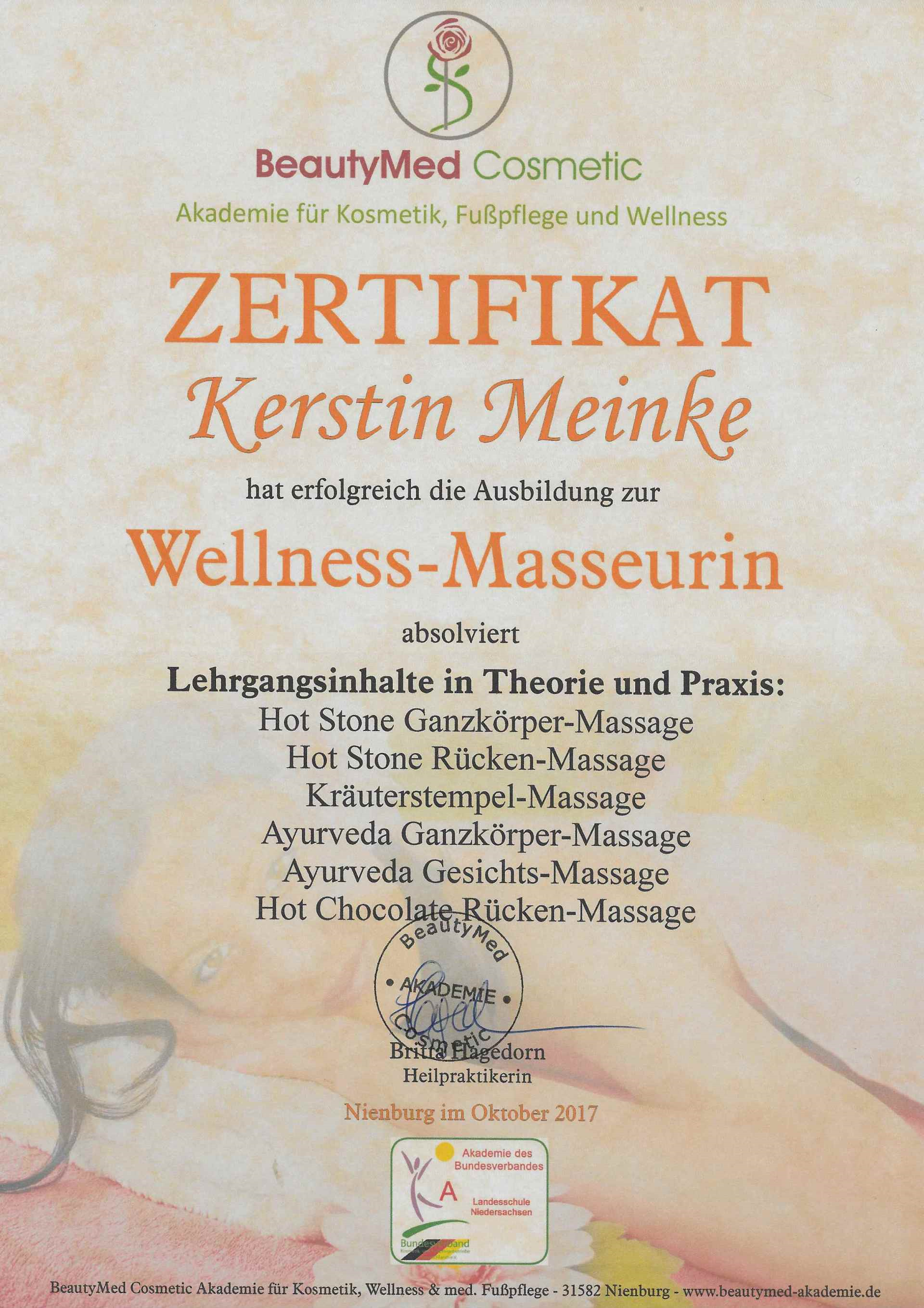 Nach erfolgreicher Weiterbildung zur Wellness-Masseurin mit den Zusatzqualifikationen Wellness- & SPA-Kosmetik / Ayurveda Gesundheitsberaterin und der Ausbildung zur Fußpflegerin, ist es mein Ziel meine Kunden durch Massagen, Kosmetik, Fußpflege und Fitness auf dem Weg zu einem neuen Wohlbefinden zu begleiten.